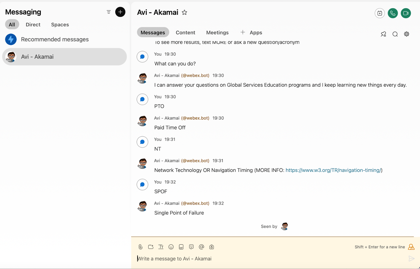 To address this challenge, Akamai implemented the Mobile Coach Platform to manage an acronym chatbot named Avi. Deployed over the enterprise’s Webex Teams environment, Avi provides secure and easy access to acronym definitions for authorized personnel.
